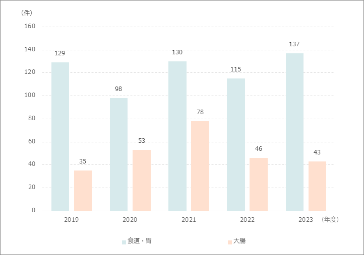 大腸内視鏡検査数も経年的に増加し、多数のポリープ、早期がんが発見され、内視鏡的粘膜切除術(EMR)や内視鏡的粘膜下層剥離術(ESD)にて治療しています。