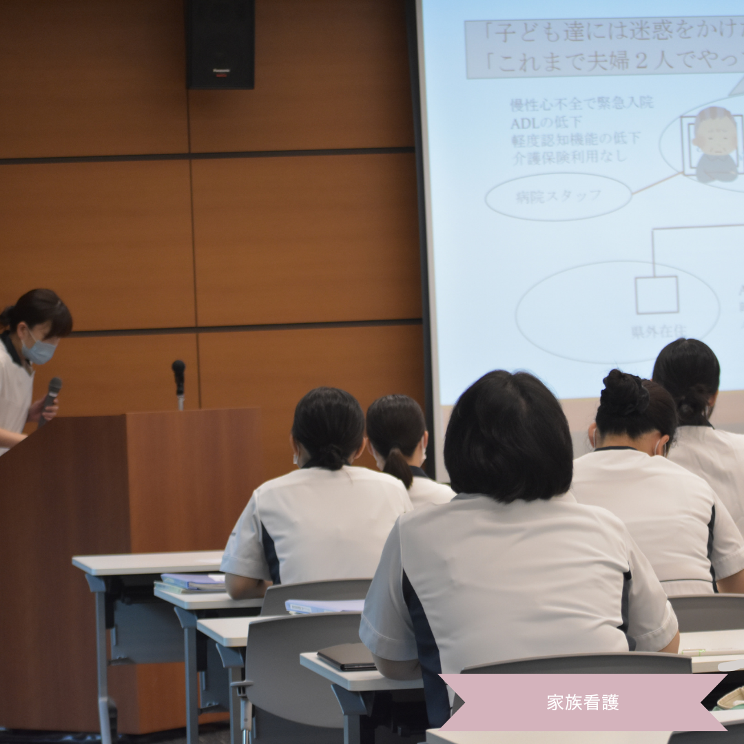 「家族看護」では、籔内家族支援専門看護師による講義を受講し、「家族との関わり方や声の掛け方、どんな質問をすることで家族からの情報収集ができるのかを講義や事例について話し合うことで学ぶことができた」「家族看護を行なう際には接遇をしっかりと行い、良好な関係を築けるよう意識しようと思った」などの感想が聞かれました。