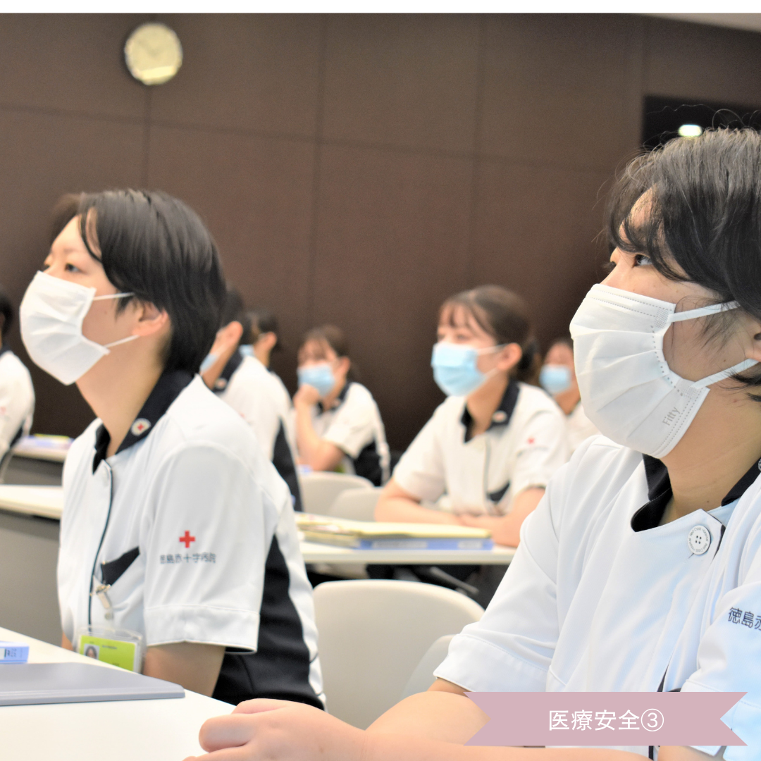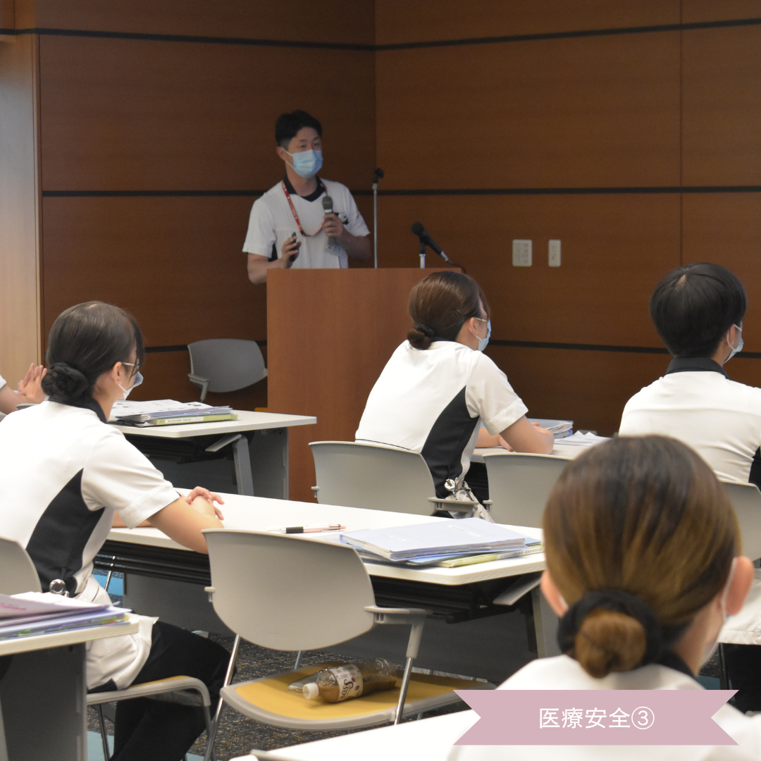 「医療安全3」では、坂田看護副部長による講義を受講し、「医療安全について当院でのインシデントをもとに何が原因か、どこに注意すると防ぐことができるのか学べた」「医療事故を起こさないためには十分な知識が必要だと再認識できた。今後もしっかりと知識を身につけて研修に取り組んでいきたい」などの感想が聞かれました。