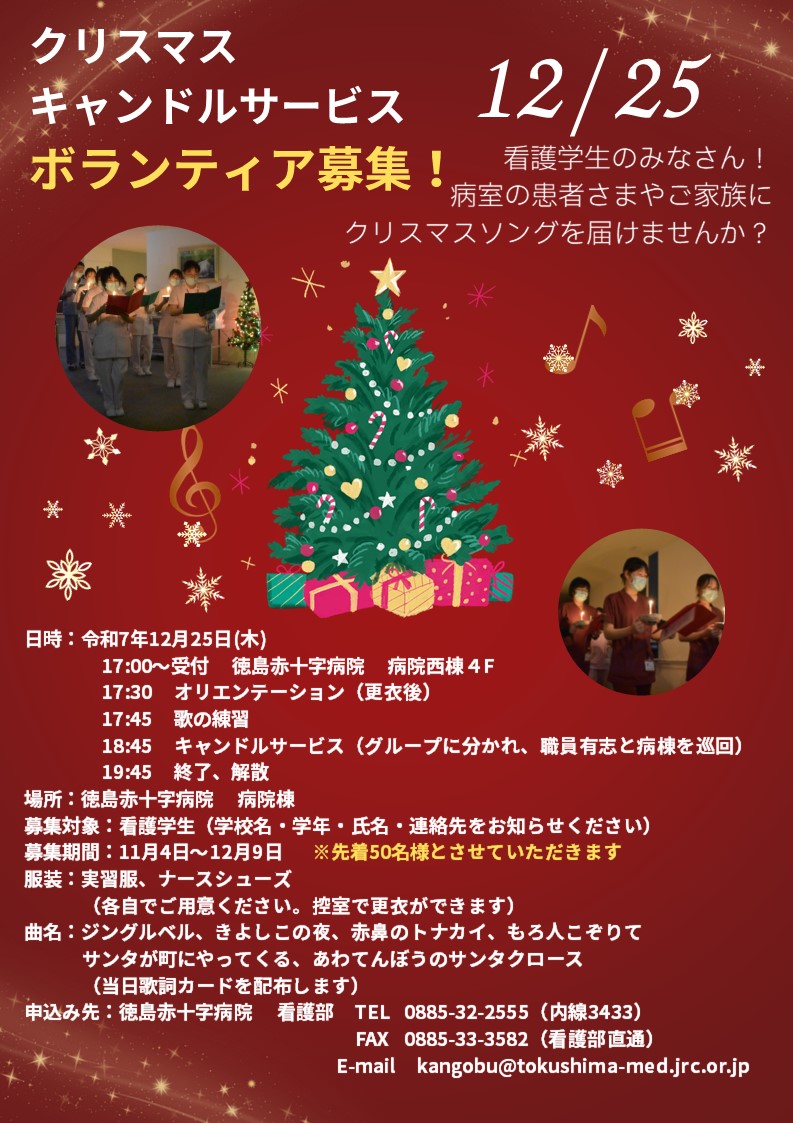 看護部です。12月25日(木)に開催する「クリスマスキャンドルサービス」にご参加いただける看護学生のボランティアを募集いたします。詳しくは、ポスターをご覧ください。皆様のご参加を心よりお待ちしております。
