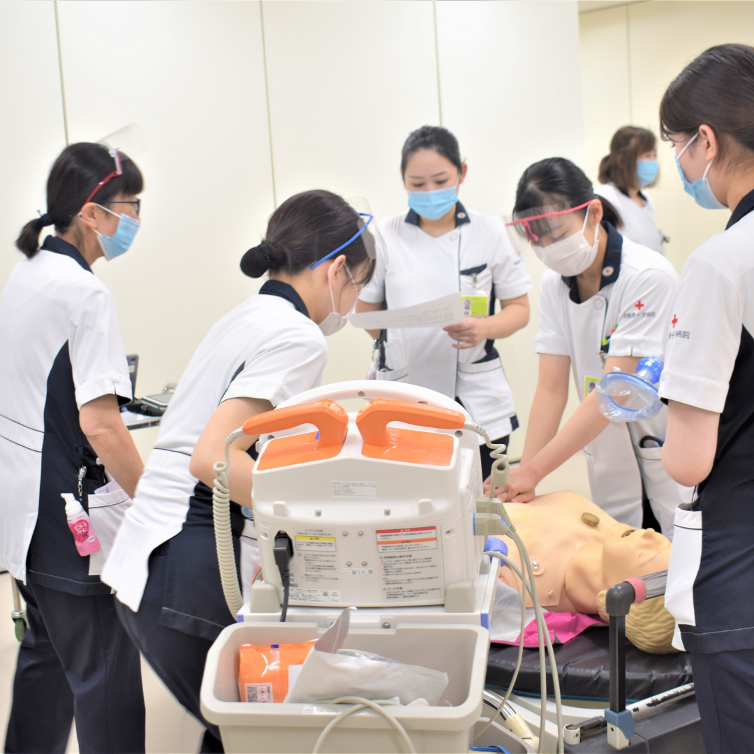 臨床研修看護師もこのような研修を通して、患者の急変時に医療チームの一員として、いのちを救う行動がとれるよう訓練しています。