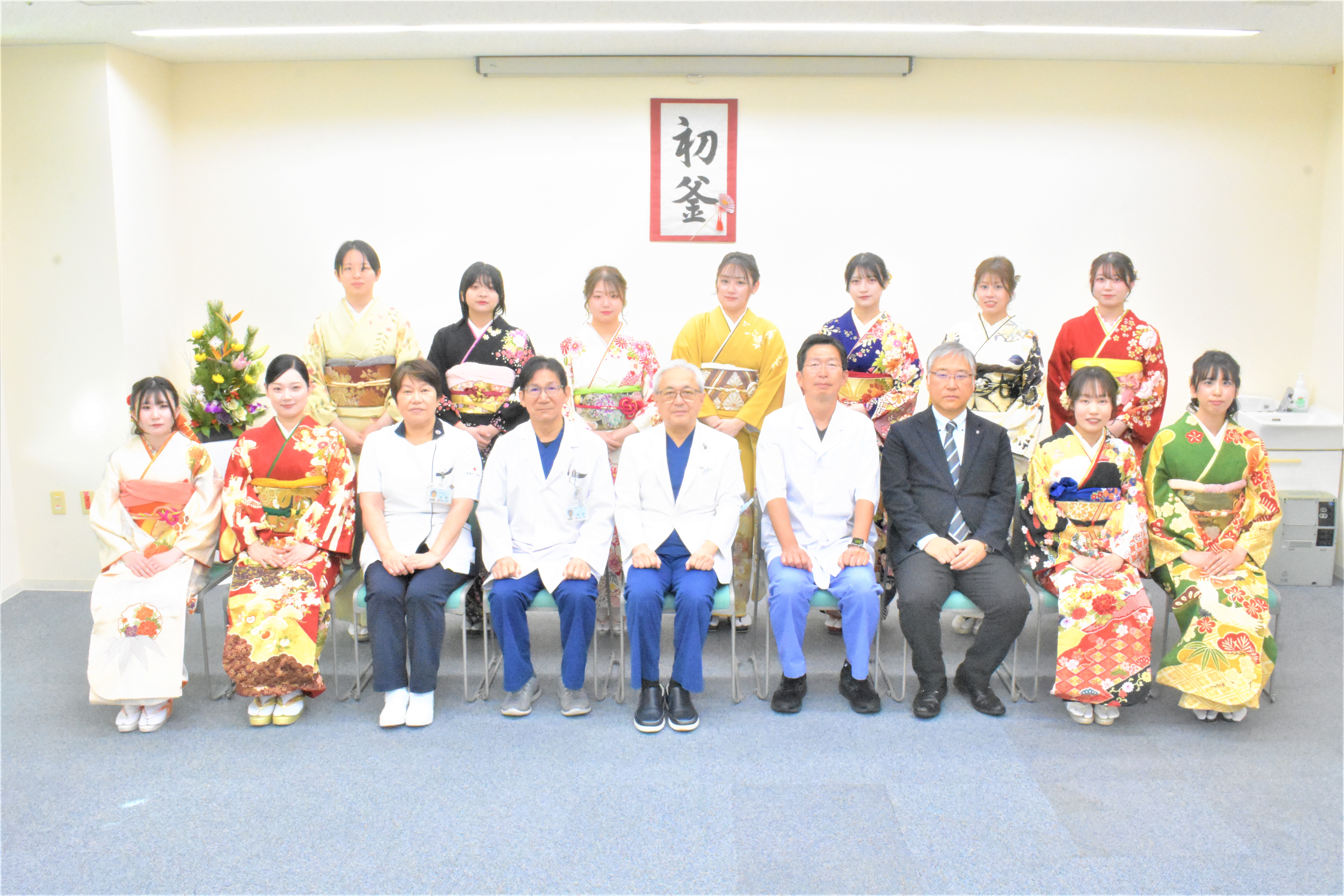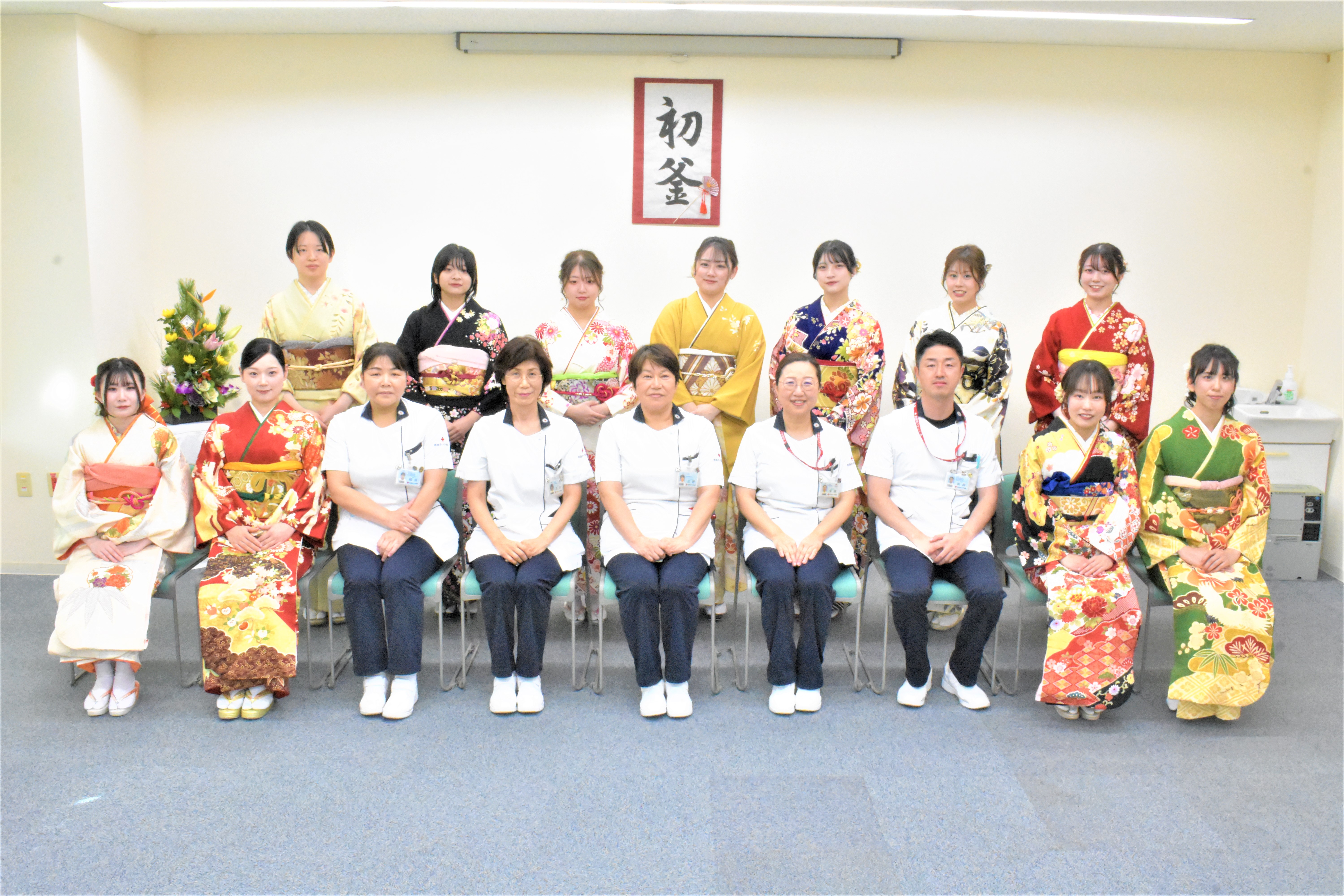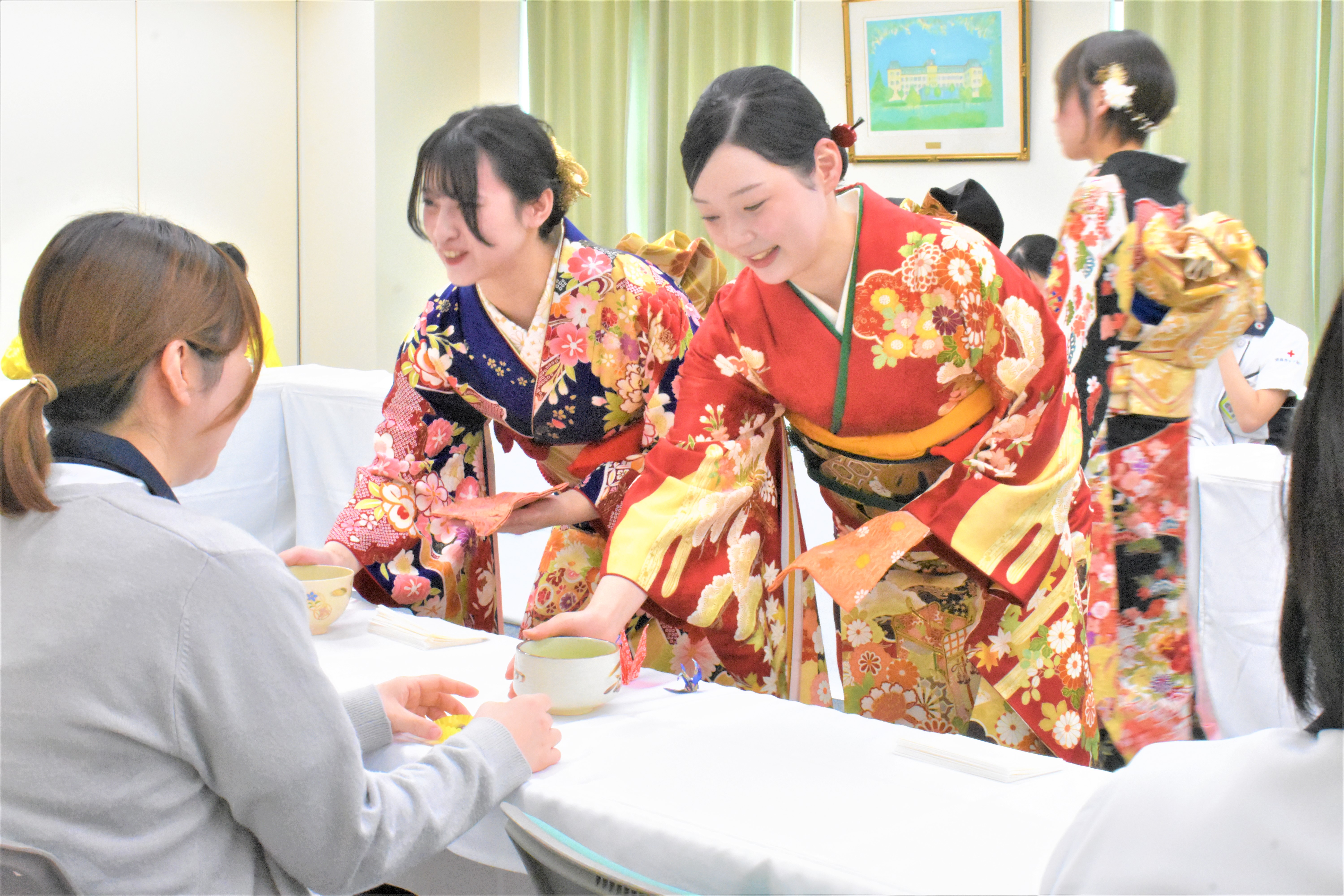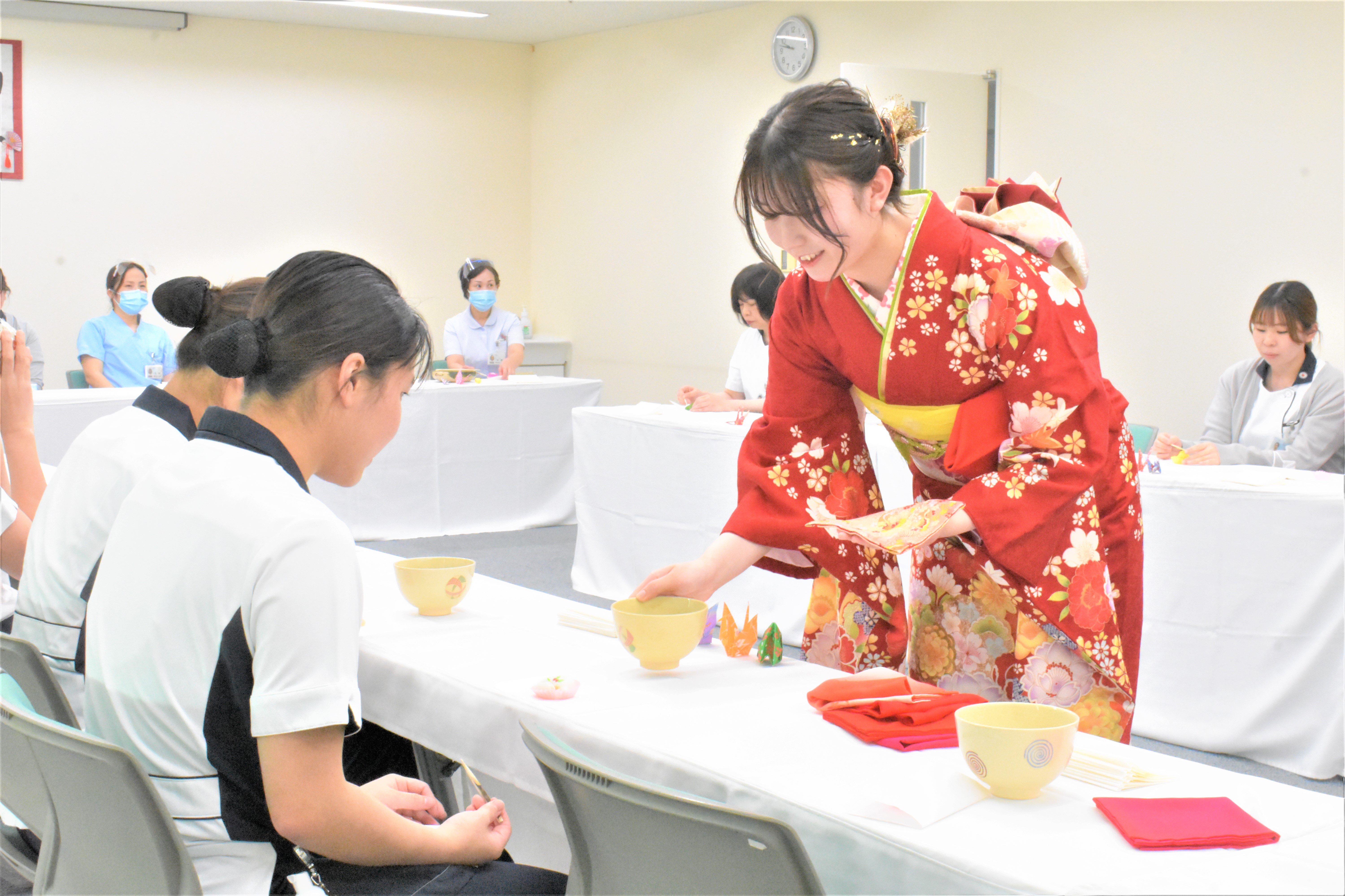 そして、11名の職員が華やかな振袖を着てお茶のお運びをしました。臨床研修看護師も参加し、9名がお運びを行いました。