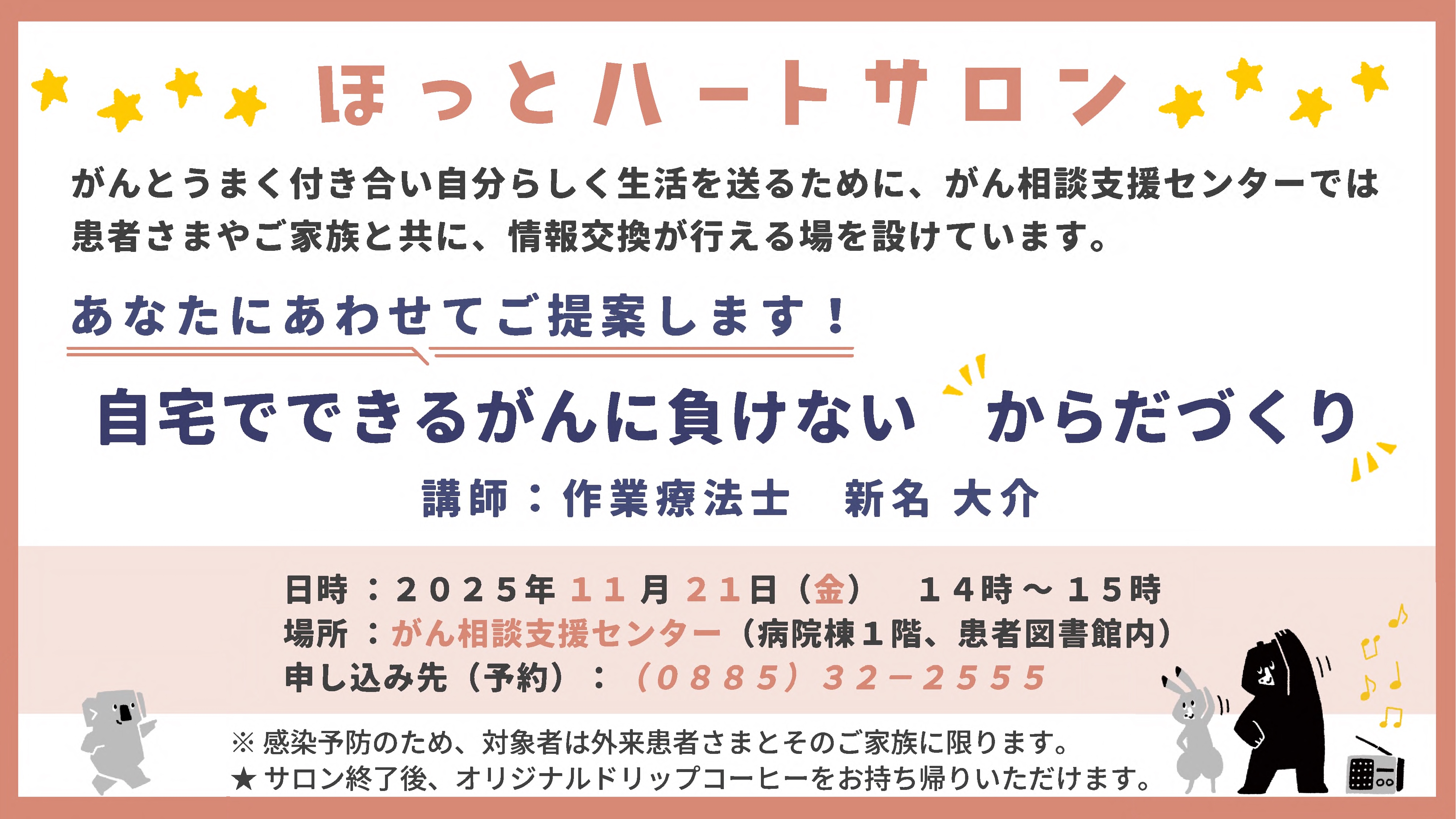| 申込方法 | がん相談支援センターへご連絡ください (0885)32-2555 |