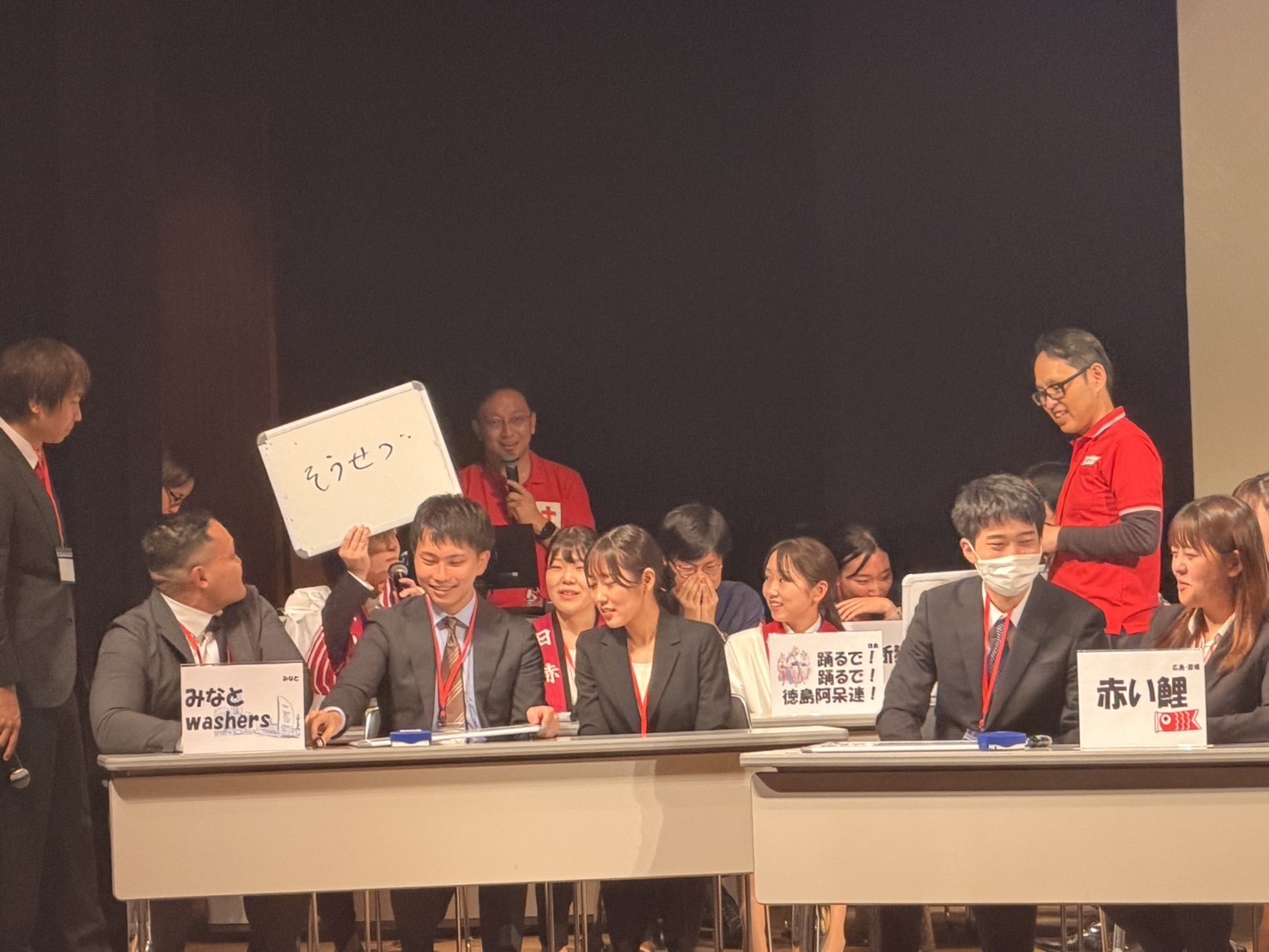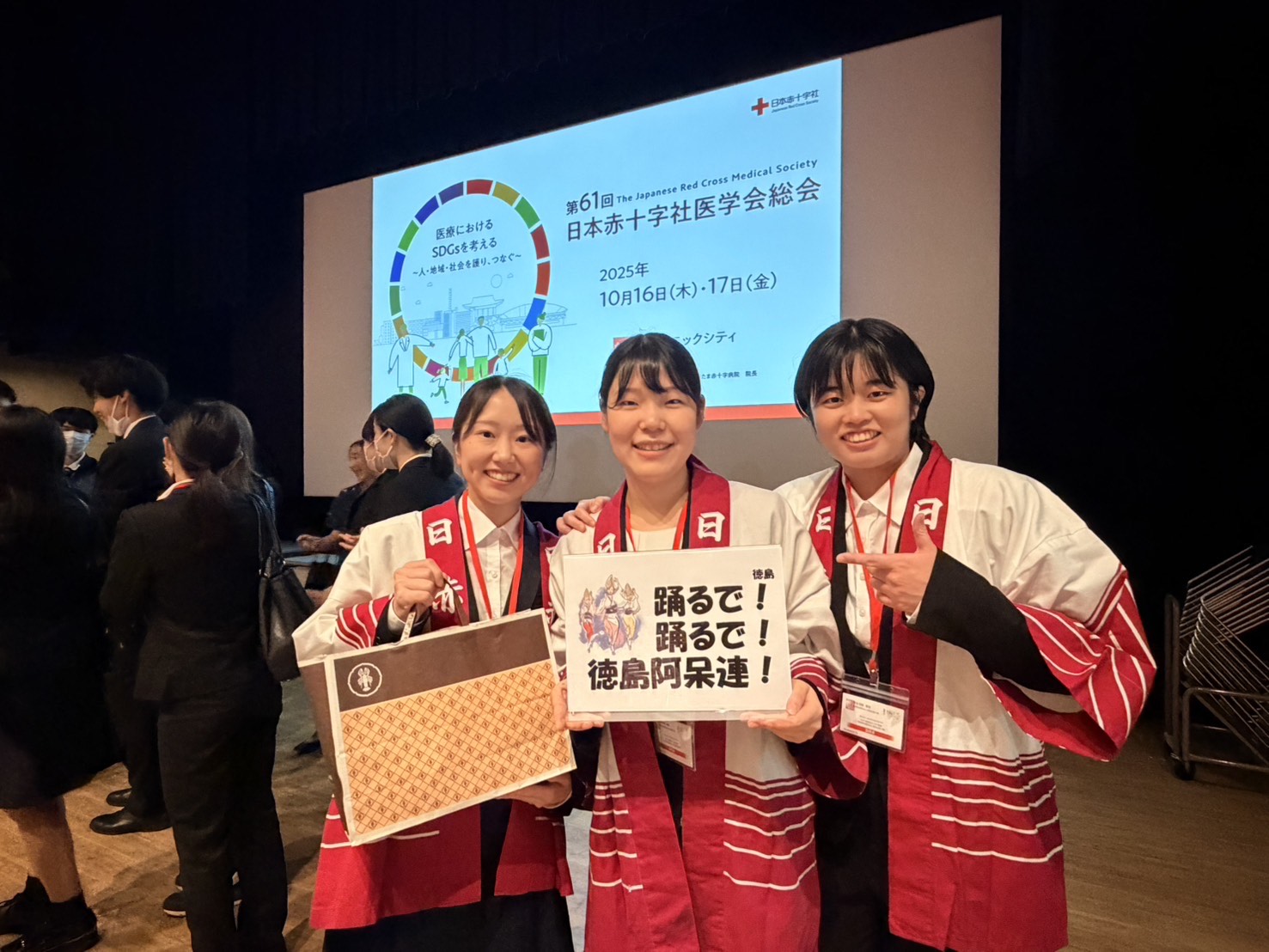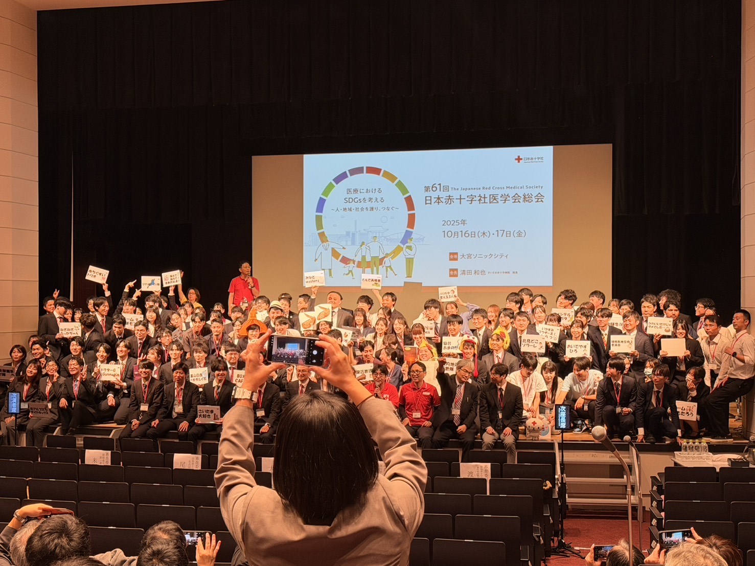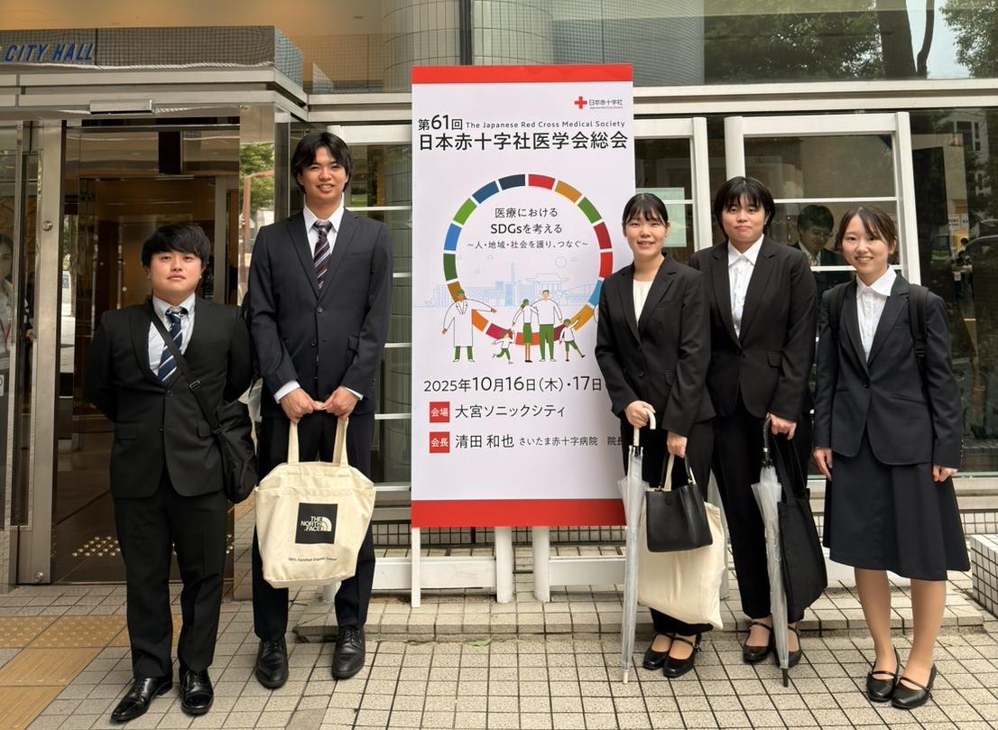 10月21日に埼玉県「大宮ソニックシティ」で第61回日本赤十字社医学会総会が開催され、研修医5名が参加しました。研修医2年次の3名がRed Cross Resident Super Arenaという全国の日赤病院の研修医が出場する臨床推論の大会に参加しました。今大会では参加チーム数が多く、昨年の優勝チームである当院はシードで決勝からの参加となりました。私は応援席で観戦していましたが、各チームのユーモアある回答や斬新な回答に、「その視点は無かった」と多くの気付きや知見を得ることができました。結果は6位に終わりましたがかっこいい2年次の姿を見て感化され、多角的な視点で臨床の推論を進められるよう日々の診療と勉強を頑張ろうと思いました。来年は福岡で開催されるので、良い結果を残せるよう精進したいと思います。