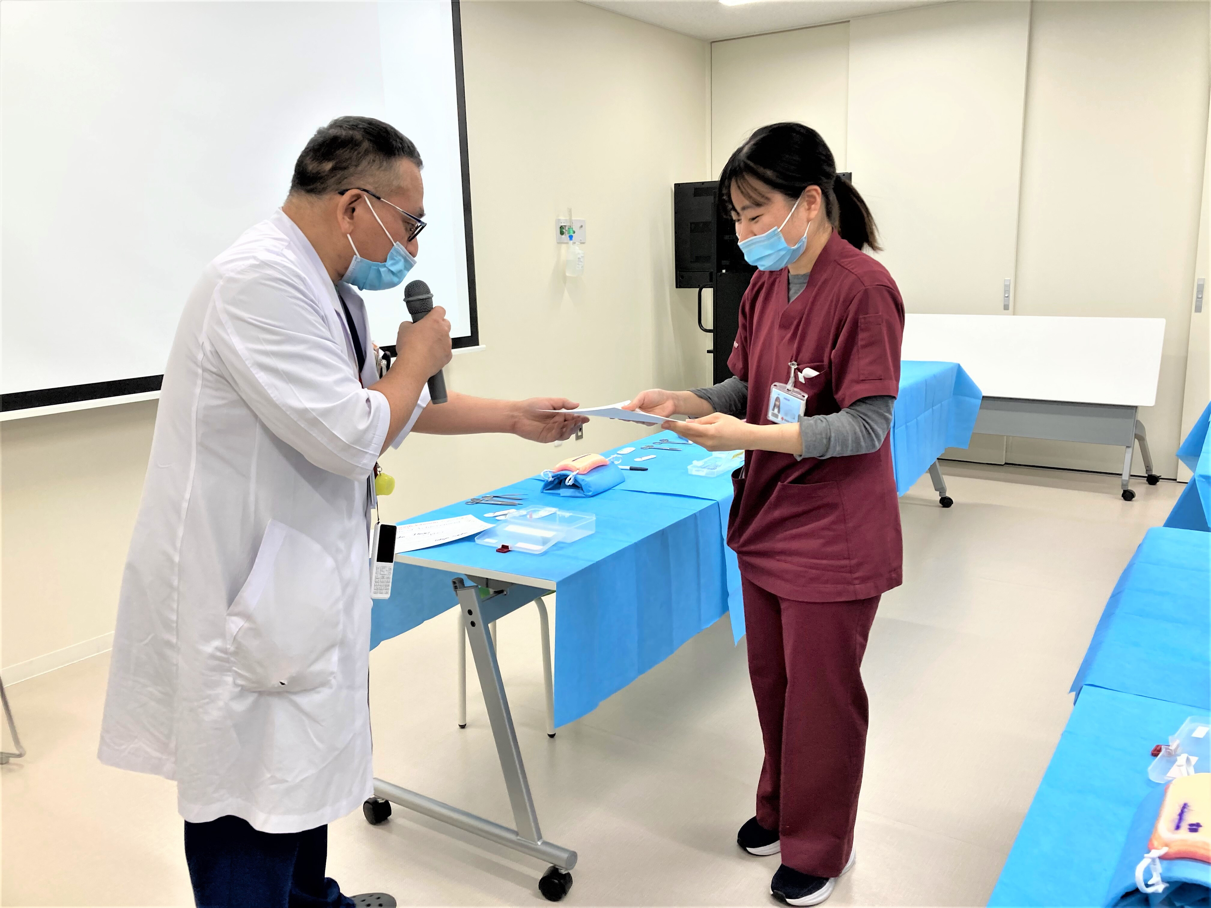 2月17日、第3回目の皮膚縫合研修が開催されました。当院では年3回、形成外科の先生から直接縫合手技をご指導いただける皮膚縫合研修があり、3回目の皮膚縫合研修では年次ごとに腕を競うコンテストが行われます。模型を使用し、形成外科の先生方の指導の下、第1回・2回の研修内容で学んだことを思い出しながら、単結紮縫合・真皮縫合の練習を行いコンテストに挑みました。私自身、手技には苦手意識がありますが、研修のおかげで以前よりは少し上達したように思います。緊張感が漂う中の縫合で、なんとか優勝することができました。